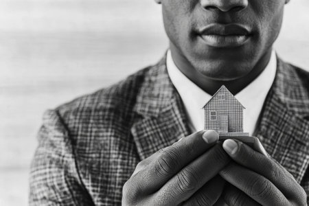 Businessman Holding Small Model House Real Estate and Investment Concept in Black and White.