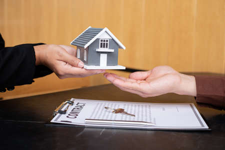 Hand a real estate agent, hold the home model, and explain the business contract, rent, buy, mortgage, loan, or home insurance.