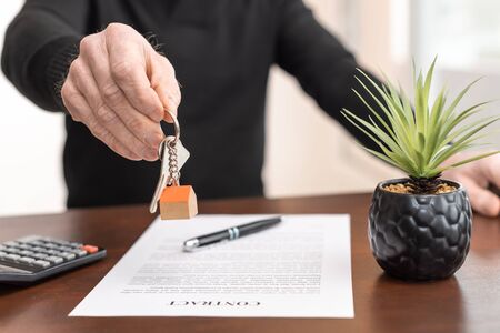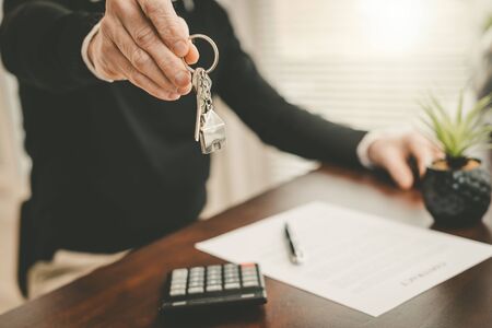 Real estate agent holding house key on table with house designs document,calculator,model house.Concept for real estate.