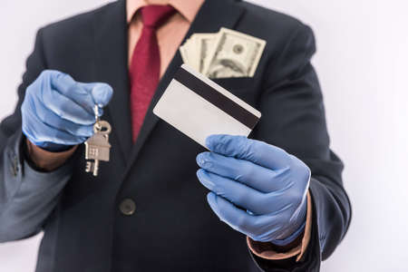 safety sale or rent house man in medical gloves hold house key and dollar. ncov2019