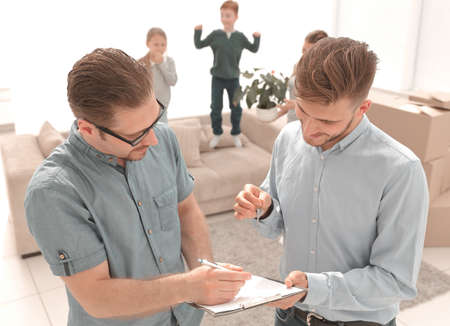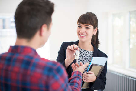 A home rental company employee is handing the house keys to a customer who has agreed to sign a rental contract, explaining the details and terms of the rental. Home and real estate rental ideas.