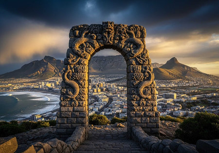 A stone archway overlooking a city and ocean with mountains in the background at sunset