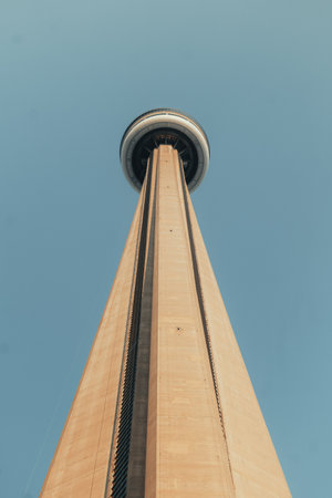 Looking up at the CN Tower against blue sky in Toronto. Ontario