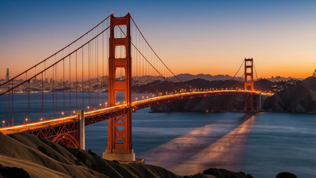A stunning image capturing the Golden Gate Bridge at sunset with the San Francisco skyline in the background, highlighting the iconic architecture and serene water below. This photo emphasizes beauty, tranquility, and architectural brilliance. AI generated image