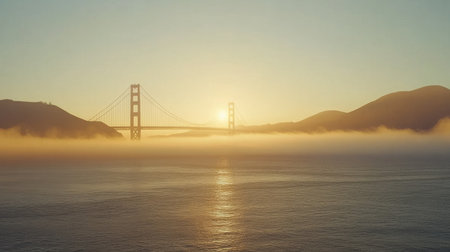 Iconic Golden Gate Bridge partially hidden by morning fog as the sun rises, creating a dreamy ambiance