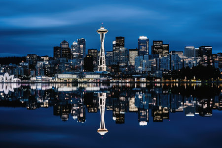 A skyline of a big city in the night with water reflections