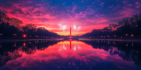 Brilliant fireworks burst above the Washington Monument as the sky transitions from day to night, reflecting vibrant colors in the calm waters of the pool below, creating a festive atmosphere.