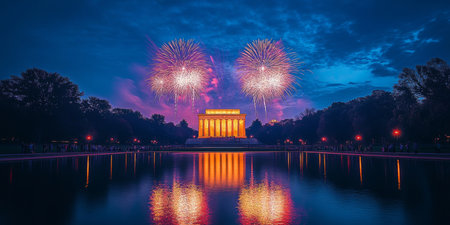 Vibrant fireworks burst in the sky above the Memorial as their reflections shimmer in the water, creating a stunning display during a festive celebration in at twilight.