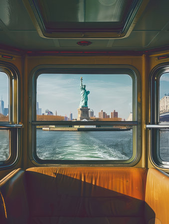 Train window view of Statue of Liberty in New York City with cityscape and blue sky. Serene scene captures iconic landmark and urban landscape. Perfect for travel agency and tourism use.