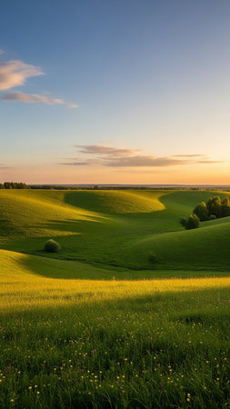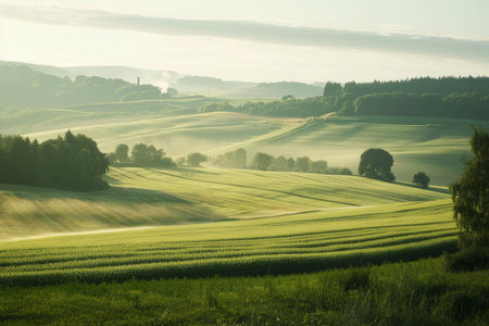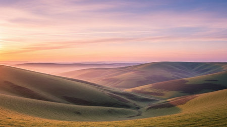 Majestic landscape of rolling hills bathed in the soft light of an early morning sunrise