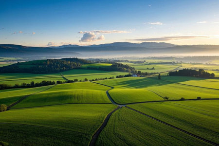Tranquil early mornings in green fields, idyllic scenery under the mountains
