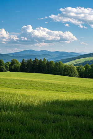 Green grassland and distant mountains with blue sky and white clouds landscape