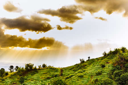 Atmospheric sunset with film-like strip of sunlight. Storm clouds and rain clouds give a nice evening over the Rhône Valley in France