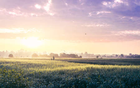 Beautiful morning landscape of sunset over young green cereal field