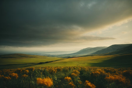 Majestic sunrise over green hills.