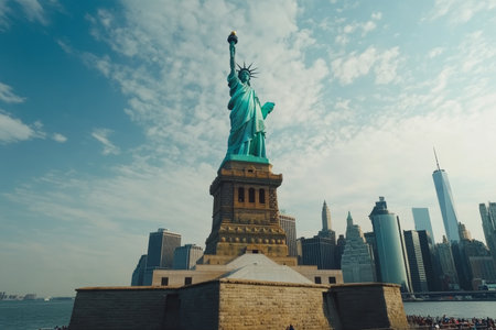 Generative AI : Panoramic of The Statue of Liberty in New York City Statue of Liberty with blue sky over hudson river on island Landmarks of lower manhattan New York city