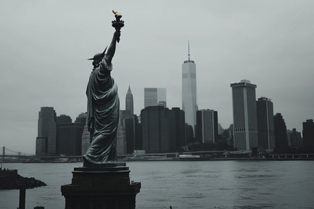 The statue of liberty overlooks lower manhattan a stunning new york cityscape and tourist landmark