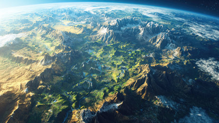 A 3D rendering of Earth showcasing various landforms such as mountains, valleys, rivers, and plains,