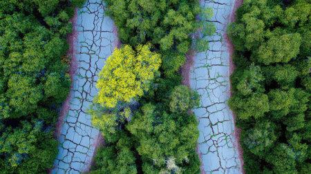 An aerial view displays two winding pathways cutting through a vibrant green forest. The paths are gray with intricate crack patterns. The composition is dominated by dense foliage, with a splash of yellow leaves. The image uses overhead lighting. Suitable for illustrating concepts of choices or journeys, this photo has commercial applications.