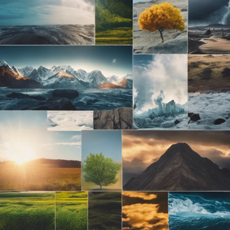 A collection of stunning landscapes features towering mountains, vibrant trees, and rushing waters. The images capture the beauty of nature in various lighting from dawn to dusk.