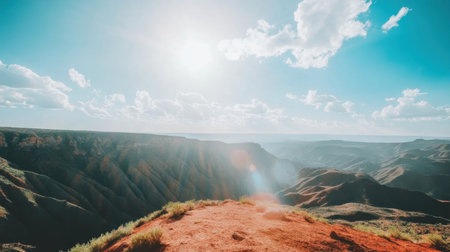 This stunning landscape captures a rocky canyon bathed in sunlight, showcasing vivid colors against a serene blue sky with soft clouds.