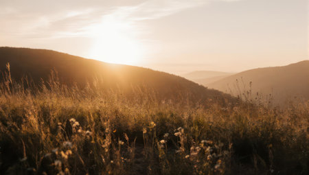 A tranquil mountain scene bathed in the warm light of the setting sun, highlighting a meadow filled with tall grasses and distant peaks.