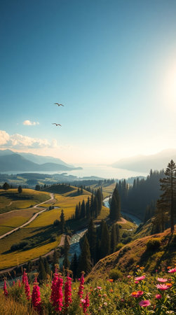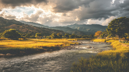 Captivating landscape featuring a flowing river bordered by lush hills under a dramatic sky. Ideal for nature lovers seeking tranquility and beauty.