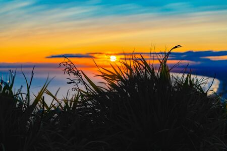 Flax silhouetted at sunrise back-lit by golden sunrise at summit Mount Maunganui.