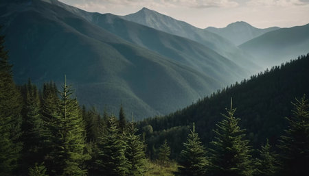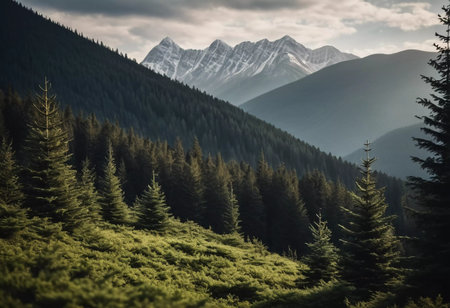 Majestic mountains tower over a serene spruce forest beneath a dramatic sky, showcasing nature beauty at dusk. Towering mountains with rolling hills and moody sky highlighting peaceful wilderness. AI.
