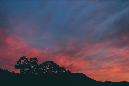 pink sunset sky with beautiful clouds rolling over the hills of Tasmania, Australia