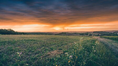 Atmospheric sunset with film-like strip of sunlight. Storm clouds and rain clouds give a nice evening over the Rhône Valley in France