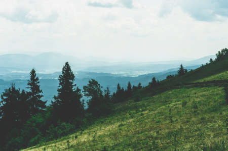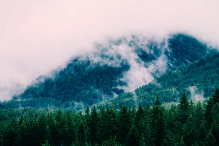 Misty fog in pine forest on mountain slopes. Color toning, faded. Forested mountain slope in low lying cloud with the evergreen conifers shrouded in mist in a scenic landscape view