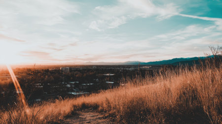 A scenic landscape view from a grassy hill at sunrise or sunset. The warm golden light illuminates the valley below and the partly cloudy sky above.