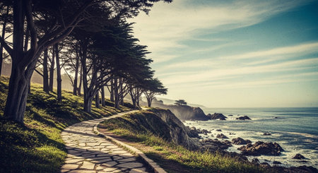 Golden hour illuminates the wildflowers blooming along the rugged coastal cliffs, creating a stunning natural tapestry against the backdrop of the setting sun over the ocean.