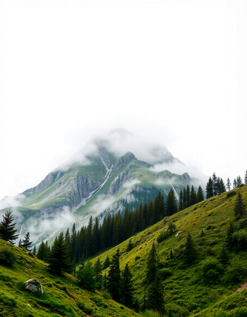A breathtaking view of a misty mountain landscape featuring towering evergreen trees and a soft blanket of fog, evoking serenity and tranquility in nature's beauty.