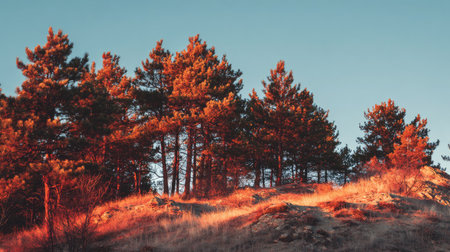 Capture the serene beauty of a hillside at sunset, where evergreen trees bask in warm light, creating a peaceful atmosphere and showcasing nature's splendor.