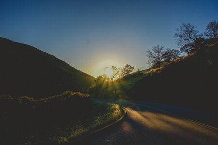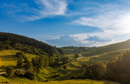 A narrow automobile paved intermountain road passes and meanders among low hills covered with spruce forests and meadow grass, against the background of an evening sunny cloudy sky