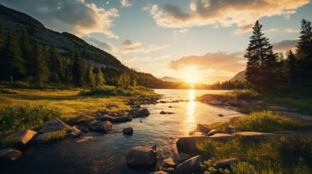 a stunning stock photo capturing the beauty of a sunrise as it shines through the mountains in a rocky landscape. this photo showcases sparkling water reflections, romantic riverscapes, and the breathtaking nature of norway. with its photo-realistic landscapes and pastoral scenery, this high-resolution image is perfect for those seeking a cabincore aesthetic or looking to enhance their visual content with 8k resolution. ai generated