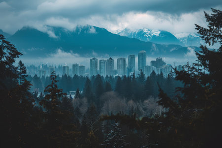 Vancouver’s skyline emerges from the mist, framed by towering mountains and lush trees, creating a serene landscape on a cloudy day.