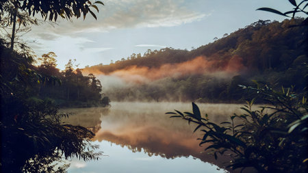 Morning mist over the lake in the morning at Khao Yai National Park, Thailand
