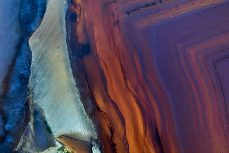 Cross-section by polished agate with beautiful wavy pattern on smooth cut surface. Blue gem detail with uneven rusty border and mirroring on shiny dark background. Silica item from north-east Bohemia.