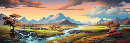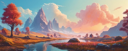 Beautiful fantasy landscape with river and mountains. Digital art painting.