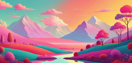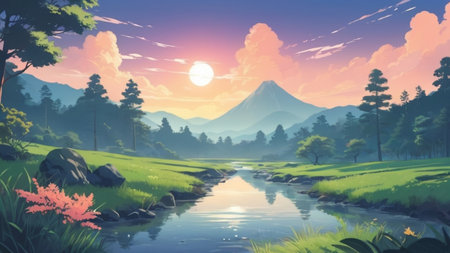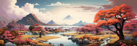 A vibrant anime painting capturing the serene beauty of a mountainous landscape, adorned with whimsical trees and blooming flowers, inviting viewers to immerse themselves in the colorful world of art