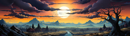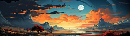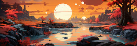 Fantasy landscape with river and mountains at sunset. Digital illustration.