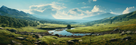 Panoramic view of mountain lake in the highlands of Scotland