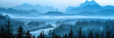 A tranquil river flows through verdant mountains, enveloped in morning mist. The serene landscape captures the essence of nature's beauty and calmness at dawn.