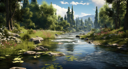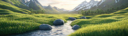 Fantasy scenery. Mountain river and meadow. 3d rendering