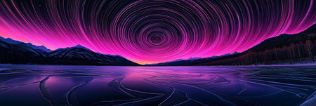 Long exposure capturing mesmerizing circular star trails illuminating a frozen lake and snow-capped mountains. Vibrant star trails painting the sky above frozen lake and mountains. Aurora and the stars swirl in circular patterns