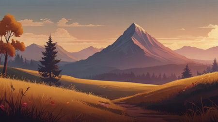 A stylized illustration depicting a majestic mountain range at sunset over a field of golden grass, with a tranquil and serene atmosphere.