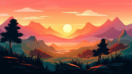 Illustration of dawn in the mountains. A picturesque view of the valley. Generative AI